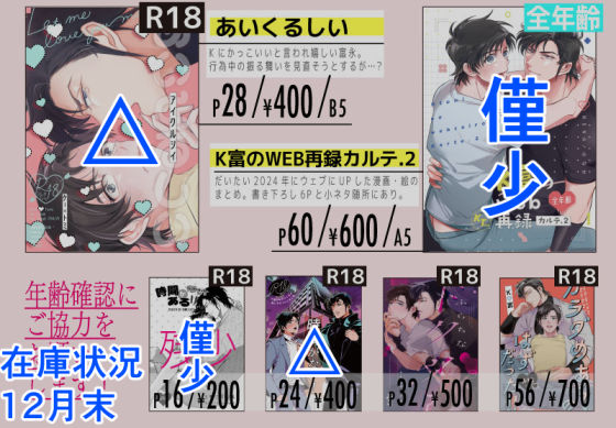 去年は中学生っぽい子が全年齢向け本を買ってってくれたな〜。ティーンでK富がお好きとはお目が高いですぞ!