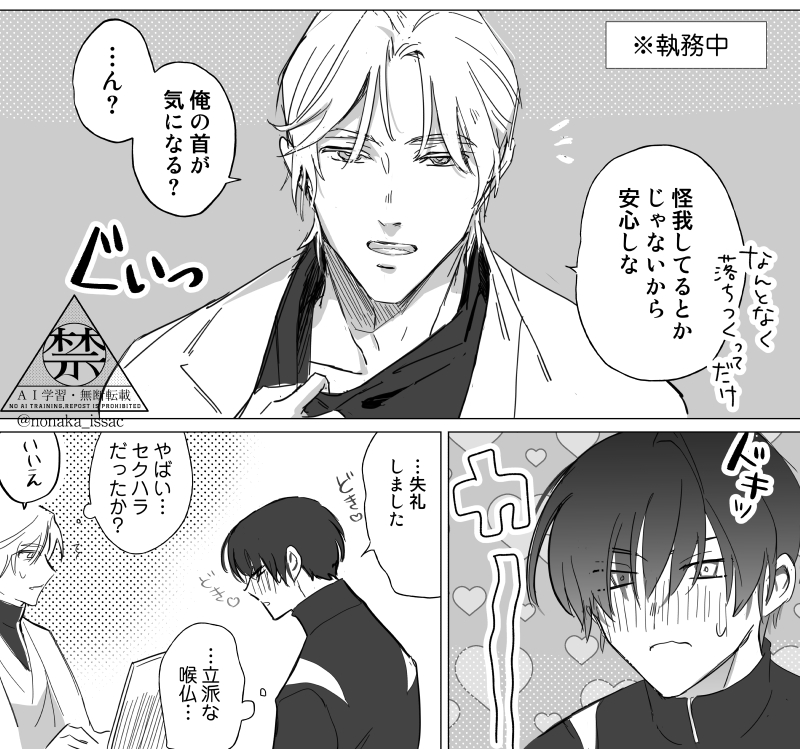 俺の首が気になる?とちょっと襟ぐりを捲って見せられるのでドギマギが止まらなくなる